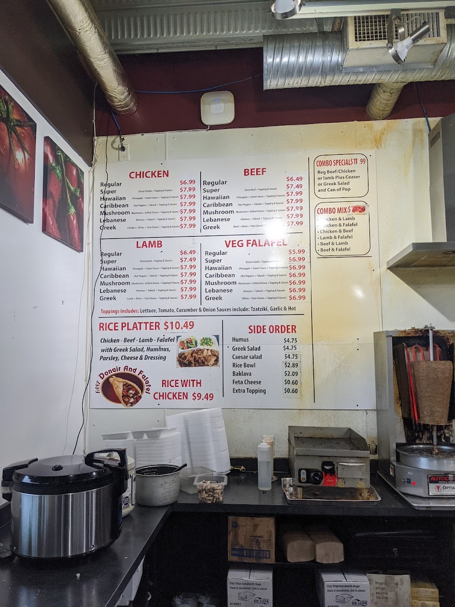 Welcome to Fast Donair and Falafel, a beloved gem nestled in Surrey, BC. This restaurant offers a vibrant menu that celebrates the rich flavors of Mediterranean cuisine, focusing primarily on donairs and falafel. Guests can indulge in a variety of mains, including Rice Platters topped with succulent meats like lamb, beef, and chicken, each available at CA$15.99 to CA$17.99. For vegetarian options, the creative Vegetable Falafel lineup features unique combinations like the Hawaiian and Lebanese falafels, priced at CA$11.49 to CA$12.99.
